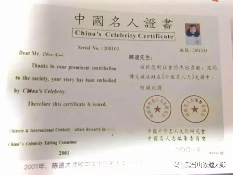 陈逵大师被授予中国名人证书